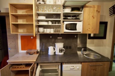 - Fully equipped kitchen: dishwasher, oven, microwave oven, coffee machine with filters, a kettle, a raclette/pierrade machine, fondue machine, a toaster, a mixer and a juicer. But also plenty of dishes, glasses (wine, champagne, beer and water glasses), cutlery sets, pots, pans...
