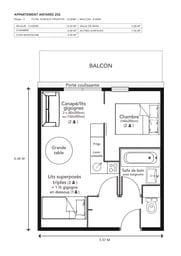 The apartment is located on the 2nd floor of residence Antarès, the same as the swimming pool. It is laid out as follows :