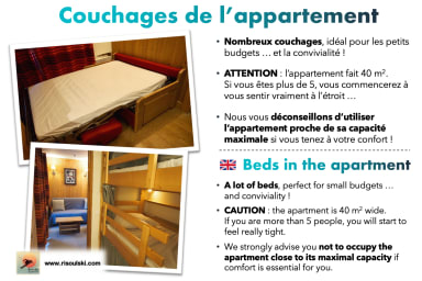 You will stay in a modern and cosy apartment. Our accommodations in the Antarès residence are laid out in a practical and comfortable way. We have optimised the space to put many beds. Therefore making it possible for families or groups of friends to gather in one apartment, by desire to be all together or for financial reasons.