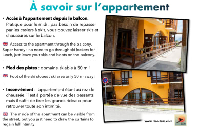 - Very well located, close to the first shops (only opened during winter and summer seasons): grocery store, ski shop, bars and restaurants...