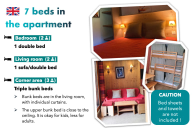 You will stay in a modern and cosy apartment. Our accommodations in the Antarès residence are laid out in a practical and comfortable way. We have optimised the space to put many beds. Therefore making it possible for families or groups of friends to gather in one apartment, by desire to be all together or for financial reasons.